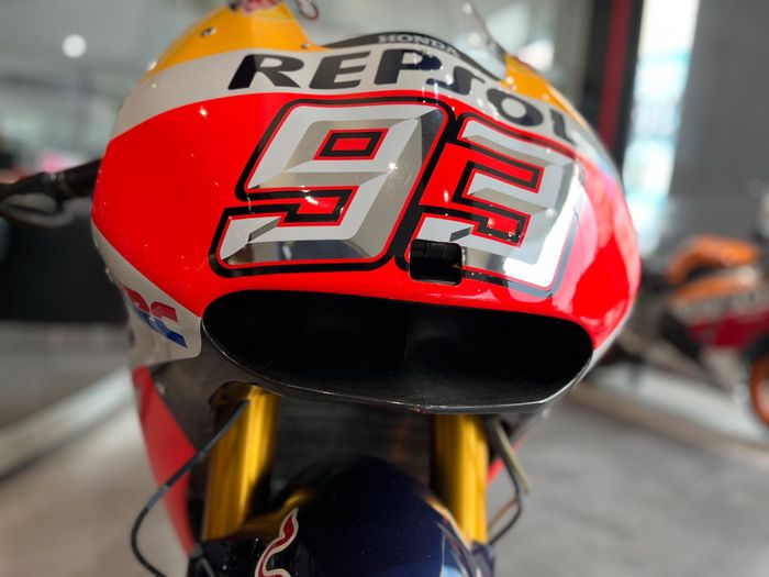 Chiếc RC213V năm 2016 này do Marc Marquez điều khiển. Đây cũng là chiếc xe mang về chức vô địch cho Marc Marquez trong mùa 2016. Số đua của Marc Marquez là 93. Lỗ nhỏ trên hốc gió một chút là nơi đặt camera. Ngay phía dưới là hốc gió khá lớn. Độ rộng của hốc gió này tùy thuộc vào yêu cầu của động cơ. Phía trong sâu của hốc gió là hai khe gió tủa ra hai bên. Ở tốc độ 350 km/h, hốc gió này có thể tăng thêm được 6% sức mạnh. Dàn áo của chiếc xe được làm từ nhựa carbon gia cố có mức độ hoàn thiện rất cao và điều này làm cho vẻ ngoài của chiếc xe rất ấn tượng. Ưu điểm của loại vật liệu này là nhẹ và có độ cứng cao.