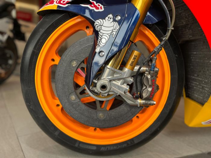 Đĩa thắng carbon của Brembo, tuy nhiên, không phải là loại đĩa thắng được sử dụng trong các cuộc đua thực sự mà là để vận chuyển. Đĩa thắng carbon hoạt động tốt nhất ở nhiệt độ từ 200 - 800 độ C và có thể duy trì hiệu suất thắng trong suốt chặng đua. Cặp heo thắng của Brembo trông rất mạnh mẽ nhưng lại rất nhẹ, khoảng 500 gram mỗi cái. Phuộc của Ohlins, được hoàn thiện rất đẹp. Sợi dây ruột gà màu đen kia có gắn cảm biến (có thể là cảm biến tốc độ hoặc cảm biến nhiệt độ) nhưng tất cả các cảm biến trên chiếc xe này đã được tháo ra.