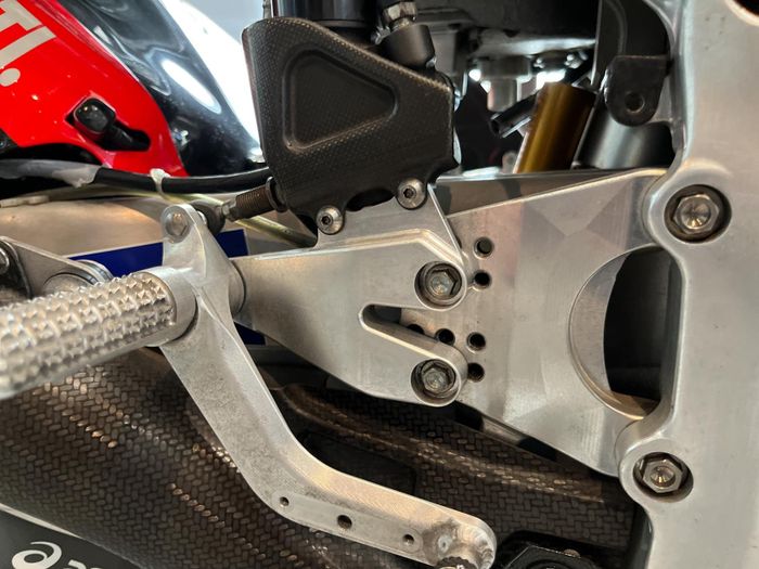 Những lỗ nhỏ trên bảng bảo vệ chân là để điều chỉnh vị trí lái. Vị trí lái đóng vai trò quan trọng vì không chỉ là vấn đề cài đặt xe, mà còn vì các tay đua cần di chuyển cơ thể để điều chỉnh trọng lượng về phía trước hoặc phía sau khi chạy. Vị trí bảo vệ chân có thể giúp các tay đua thực hiện điều này dễ dàng hơn.