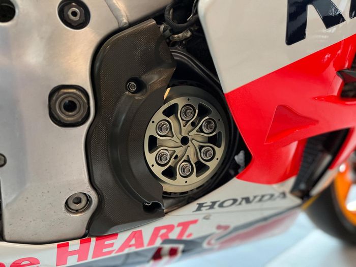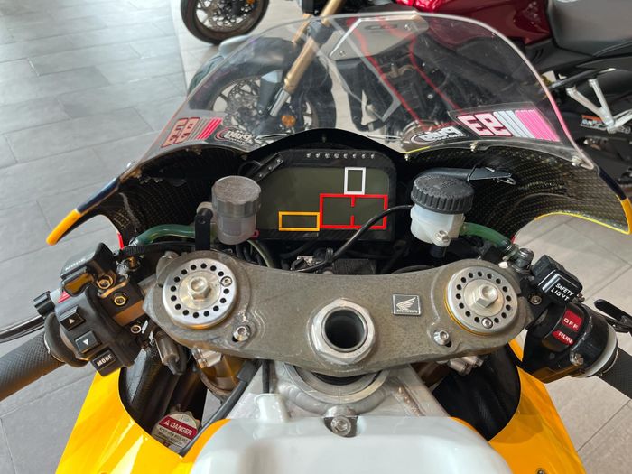 Khu vực chứa năng lượng của RC213V: tối giản là chìa khóa. Đầu tiên là màn hình được phân chia thành nhiều phần hiển thị thông tin khác nhau với các ô màu sắc đa dạng. Chỉ hiển thị thông tin cần thiết để không làm mất tập trung của tay đua. Bên phải của tay lái có nút “ĐÈN AN TOÀN”, được kích hoạt khi trời mưa hoặc tầm nhìn kém. Khi bật, đèn đỏ phía sau sẽ sáng lên, giúp tay đua đuổi kịp các đối thủ ở phía trước. RC213V vẫn sử dụng hộp số thủy lực. Tôi không nhớ Honda chuyển sang hộp số dây khi nào nhưng hiện tại, RC213V là chiếc duy nhất trong MotoGP sử dụng hộp số dây (không sử dụng hộp số thủy lực). Hai bình dầu nhỏ hai bên được bọc vải để tránh rò dầu khi rơi xe.