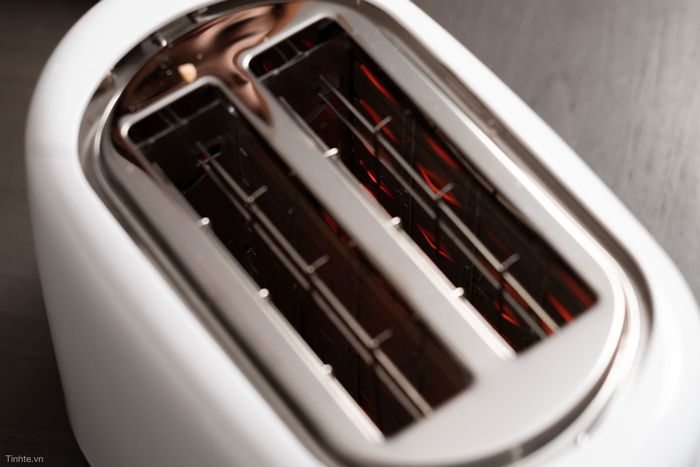 Khay nướng làm từ thép không gỉ, giống như các máy nướng bánh mì khác, có 2 khe để đặt bánh mì lên.