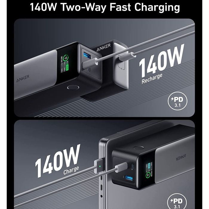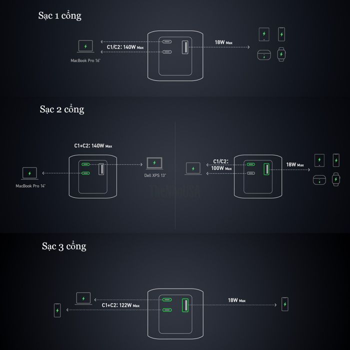 - Bao gồm: 2 cổng type C sử dụng công nghệ PD3.1 với công suất tối đa 140W (trong đó, 1 cổng C1 có khả năng sạc lại pin); 1 cổng type C với công suất tối đa 18W (QC3.0).