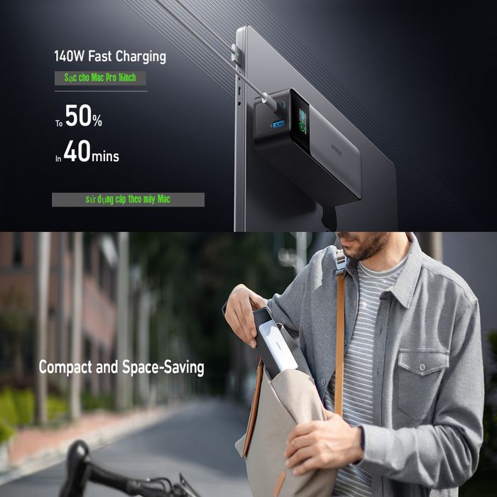 - Sạc viên pin bằng cục sạc PD3.1 Anker A2340 của Anker – max 140W giúp việc sạc đầy viên pin trong 1 giờ diễn ra dễ dàng. Mặc dù viên pin có nhiệt độ tăng nhanh khi sạc, nhưng điều này là bình thường và nhiệt độ của viên pin không đến mức cần phải quan tâm. Điều quan trọng là phải tìm kiếm các thiết bị để sử dụng hết công suất của viên pin.