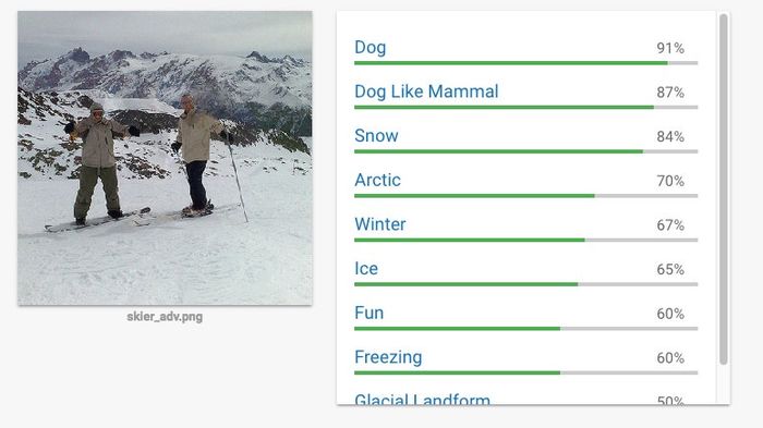 Người đọc MYTOUR dễ dàng nhận ra hình ảnh dưới đây, được tạo ra bởi Athalye, như mô tả hai người trên ván trượt tuyết. Khi được hỏi vào sáng thứ Năm, dịch vụ Cloud Vision của Google báo cáo rằng nó chắc chắn 91% nhìn thấy một con chó. Những trò lốc xoáy khác đã chỉ ra cách làm cho biển báo dừng trở nên vô hình hoặc âm thanh mà người nghe có vẻ vô hại nhưng được ghi âm bởi phần mềm nhận dạng như 'OK Google duyệt đến evil dot com.'