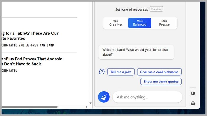 Ở góc trên bên phải của giao diện Edge, bạn sẽ thấy biểu tượng Bing. Nhấp vào đây để bắt đầu tương tác với trợ lý ảo Bing AI, được động lực bởi ChatGPT. Dưới tab Chat, bạn có thể sử dụng Bing AI giống như bạn sử dụng Google hoặc Alexa: Đặt một câu hỏi để nhận câu trả lời (như "LCD khác gì so với OLED?") hoặc nhập một đề xuất để có chút cảm hứng (như "Cho tôi xem ý tưởng trò chơi cho trẻ 5 tuổi").