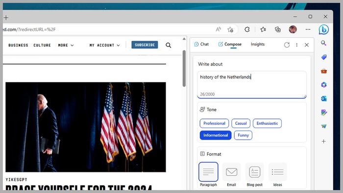Ví dụ, nếu bạn muốn một lược sử ngắn về Hà Lan, được viết theo một tông thông tin. Hãy làm các lựa chọn của bạn trên màn hình, sau đó nhấp vào Tạo bản nháp. Ở dưới phần trả lời có các tùy chọn để sao chép văn bản vào clipboard hoặc thử lại phản hồi, và bạn cũng có thể nhấp vào Thêm vào trang web nếu bạn muốn dán văn bản vào email hoặc một ô văn bản khác.