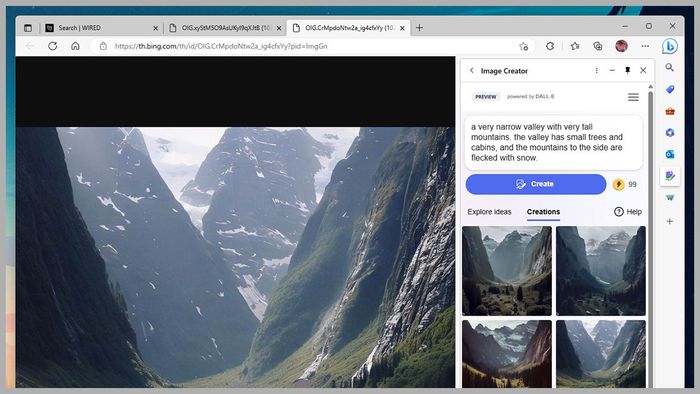 Sau vài giây, bạn sẽ thấy bốn hình ảnh đề xuất. Nhấp vào bất kỳ hình nào để xem chi tiết hơn và tìm các tùy chọn chia sẻ, tải xuống hoặc lưu vào một bộ sưu tập trong Edge. Hình ảnh bạn vừa tạo gần đây được hiển thị ở phía dưới thanh bên, để bạn có thể quay lại nếu cần, và cũng có tab Khám phá ý tưởng nếu bạn cần thêm cảm hứng.