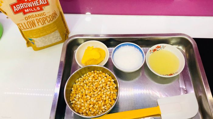 Chuẩn bị các nguyên liệu như bơ, đường, dầu ăn, bắp, định lượng tùy thích theo sở thích cá nhân.