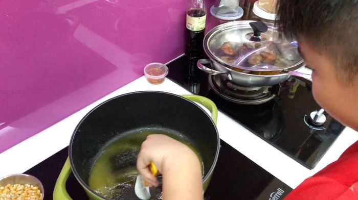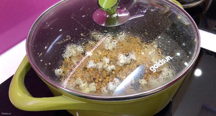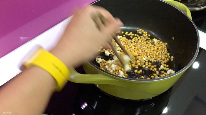Sau đó, cho bắp vào nồi, đảo đều để bắp thấm đầy hương vị bơ và đường. Khi thấy những hạt bắp đầu tiên bắt đầu nổ bung ra, đậy nắp lại.