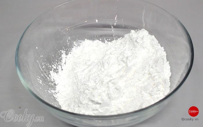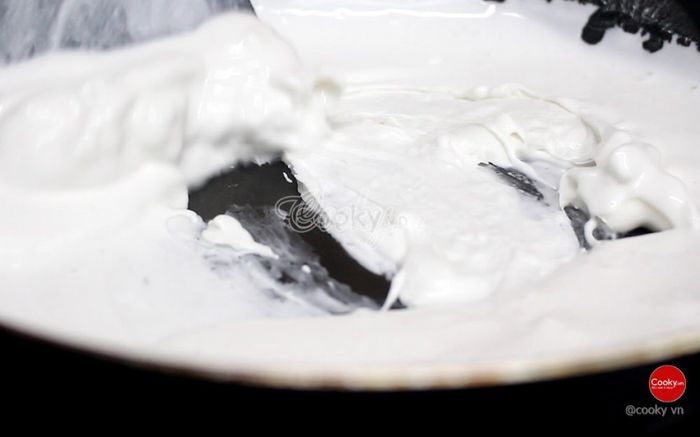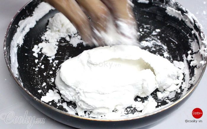 Sau 2 tiếng, hãy đun nóng chảo và thêm vào 10ml dầu ăn, đảo đều để bảo vệ bột khỏi bị cháy khi nấu. Ngay lúc này, hãy đổ hỗn hợp bột đã ủ lên chảo, nhanh chóng hạ lửa về mức thấp nhất và đảo đều cho đến khi bột kết dính. Luôn đảm bảo khuấy đều để bột không bị dính, khi thấy bột đạt được độ nặng và sệt, tắt bếp (lúc này bột vẫn hơi ẩm, không để bột quá khô vì sẽ còn phải nhồi với phần bột khô còn lại).