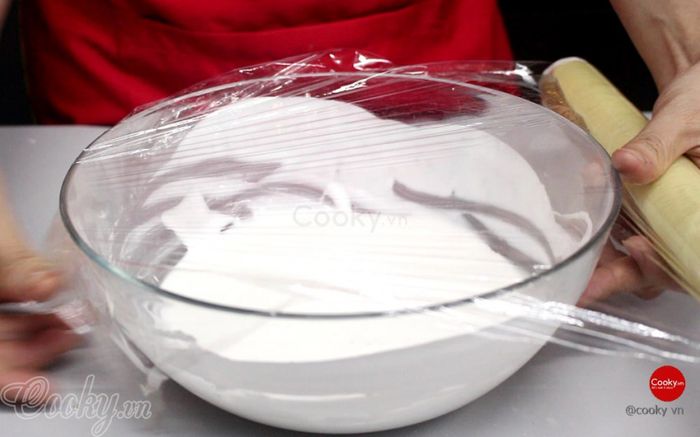 Sau khi thấy bột đã được nhào kỹ, sử dụng màng bọc thực phẩm hoặc miếng vải màn ẩm để bọc kín miệng thố, tránh bột khô. Để bột nghỉ trong khoảng từ 30 phút đến 2 tiếng.