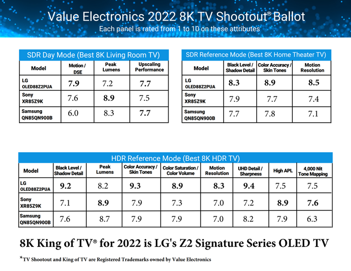 Z9K giành lại hạng mục “TV 8K phòng khách tốt nhất” cho phe LCD, LG Z2 thắng ở phần còn lại