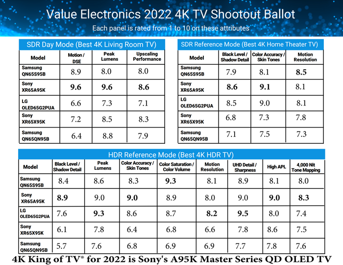 Danh hiệu “Vua của TV 4K” năm nay đã thuộc về chiếc A95K của Sony, với điểm số trung bình cao nhất. TV Shootout 2022 cũng đã làm sáng tỏ liệu công nghệ OLED mới của SDC có thực sự vượt trội so với White OLED của LGD.