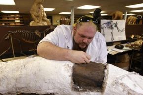 Assistant lab supervisor Trevor Valle works on Zed, carefully removing a plaster cast from one of his tusks.