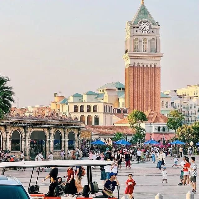 The centerpiece of Sunset Town is the 75-meter red brick clock tower facing the sea. Inspired by Italy's St. Mark’s Campanile, the Central Village clock tower mimics a lighthouse by the shore. The tower blends seamlessly with the colorful hillside homes leading to the harbor. Bustling shops line the winding streets, while vibrant flower-covered slopes add a romantic charm.