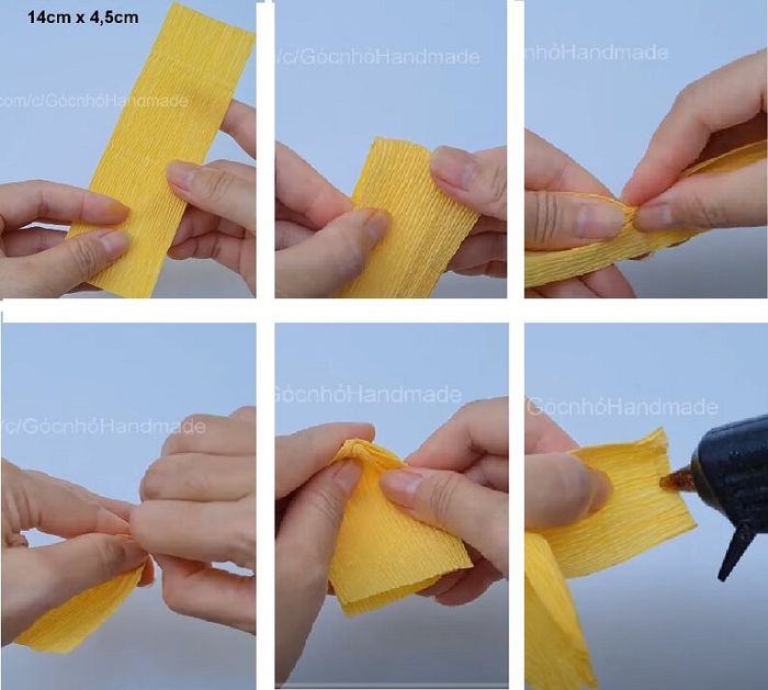 - Step 1: Cut yellow crepe paper into 20 rectangles of 14×4.5cm. Fold each rectangle in half and gather it along the horizontal fold. Twist the gathered part into a circle, fold it in half again, adjust the petals to make them plump and natural, then use wax glue to secure the petals.