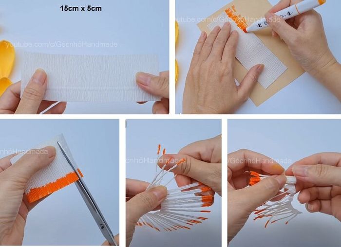 - Step 2: Creating apricot blossom stamens: Cut white crepe paper into 4 rectangles of 15x5cm. Use an orange marker pen to color the top part of the paper on both sides. Next, use scissors to cut strands with a height approximately 2/3 of the rectangle's height. Use your fingers to round each strand. Finally, roll the rectangle vertically to create the stamen.