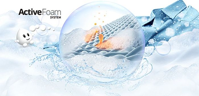 Hệ thống Active Foam giúp loại bỏ triệt để các vết bẩn khó giặt trên quần áo. Bọt siêu thẩm thấu tạo ra từ bột giặt hòa tan nhanh chóng vào từng sợi vải, bảo vệ làn da nhạy cảm và ngăn chặn cặn bám, giữ cho quần áo luôn sạch sẽ.