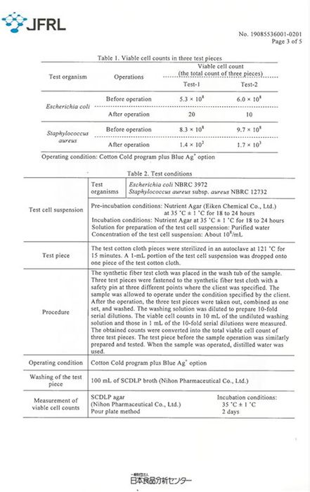 Kết quả thử nghiệm chứng minh Công nghệ Blue Ag+ hiệu quả trong việc diệt khuẩn E.coli và khuẩn tụ cầu vàng Staphylococcus aureus.