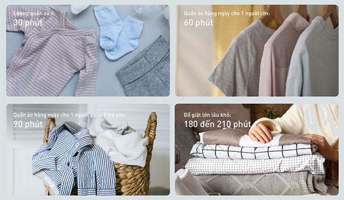 Bạn cũng có thể linh hoạt thiết lập thời gian sấy theo ý muốn với chế độ Time Dry: 30 phút - cho ít quần áo, 60 phút - cho quần áo hàng ngày của 1 người lớn, 90 phút - cho quần áo hàng ngày của 1 người lớn và 1 trẻ nhỏ, 180 đến 210 phút - dành cho đồ dày hoặc kích thước lớn mất lâu khô.