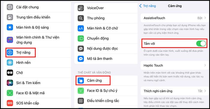 Tính năng tầm với trên iPhone có thể là nguyên nhân khiến cho bàn phím iPhone không hiển thị. Hãy thử vô hiệu hóa tính năng này theo các bước sau: Truy cập Cài đặt > Trợ năng > Cảm ứng > Tắt Tầm với.