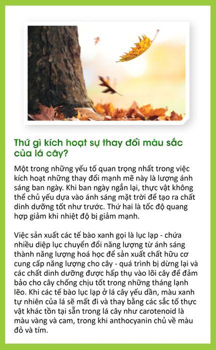 Mùa thu không chỉ là thời kỳ mà cây thay lá, mà còn là khoảnh khắc diệu kỳ khi lá xanh bỗng chốc biến thành bức tranh màu sắc. Khắp nơi trên thế giới, sự kết thúc của mùa hè được ký hiệu bằng cơn mưa lá đỏ, tạo nên biến đổi độc đáo trong vẻ ngoại hình của hàng ngàn cây cỏ. Những chiếc lá đỏ, cam, vàng nhảy múa trong gió trước khi rơi xuống đất, tạo nên cảnh tượng mơ mộng của mùa thu. Tuy nhiên, với một số loài cây, đây là thời điểm chúng phải đấu tranh quyết liệt để sinh tồn trong môi trường khắc nghiệt.