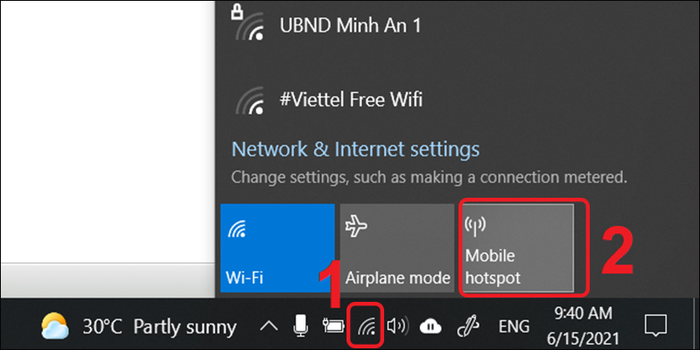 Sau khi đã đặt tên và mật khẩu cho điểm phát WiFi, bạn có thể kích hoạt chức năng phát WiFi từ laptop một cách nhanh chóng ở lần tiếp theo. Chỉ cần nhấp vào biểu tượng WiFi trên thanh Taskbar và chọn Bật Mobile Hotspot.