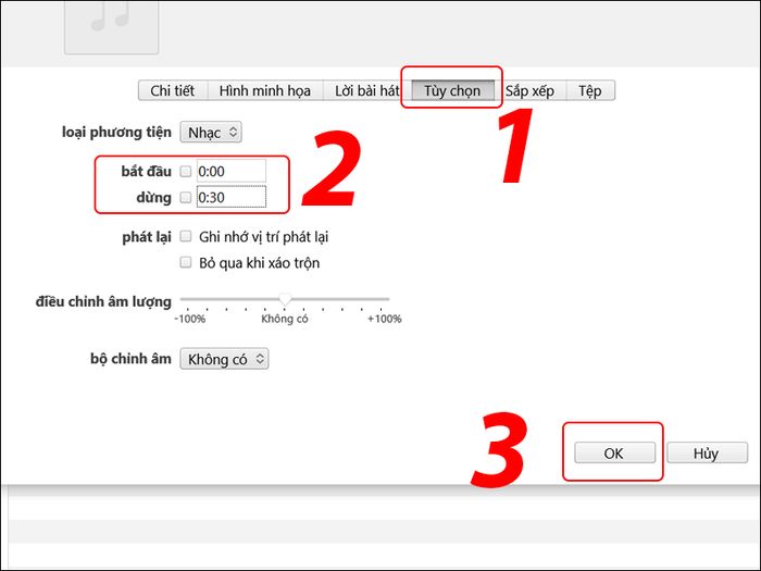 Bước 8: Nhấn tab Tùy chọn > Cắt nhạc thành đoạn 30 giây như hình > Bấm OK.