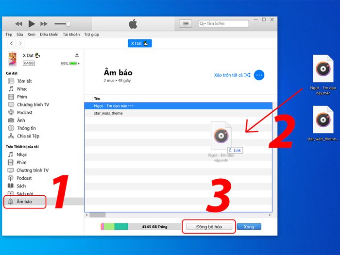Bước 13: Chọn mục Âm báo > Kéo và thả tập tin nhạc từ Desktop vào > Đồng bộ hóa. Chờ quá trình đồng bộ kết thúc, sau đó ngắt cáp kết nối giữa máy tính và iPhone.