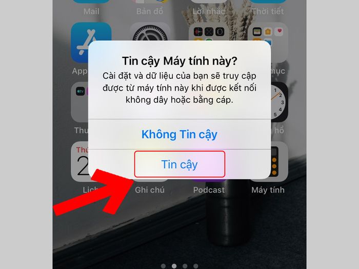Bước 4: Kết nối iPhone của bạn với máy tính sử dụng cáp > Bấm Tiếp tục trên máy tính và Tin tưởng trên iPhone.