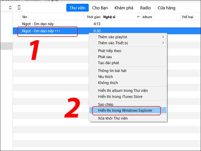 Bước 10: Chuột phải vào đoạn nhạc chuông mới cắt > Chọn Hiển thị trong Windows Explorer để đưa nhạc chuông vào thư mục.