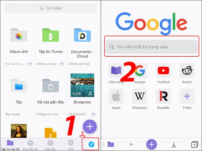 Bước 2: Chạm vào biểu tượng la bàn ở góc dưới cùng bên phải và vuốt sang trái > Nhập tên trang web bạn muốn tải bài hát vào ô tìm kiếm.