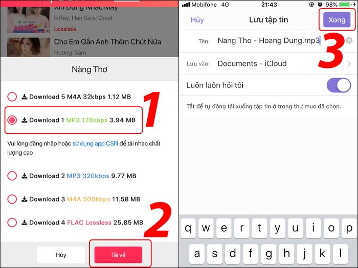 Bước 4: Lựa chọn chất lượng bài hát theo sở thích của bạn > Bấm Tải về > Sửa tên bài hát và nhấn Xong để tải về. Bài hát tải về sẽ nằm trong iCloud của bạn.