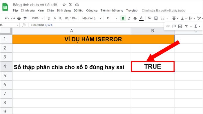 Bước 2: Nhấn phím Enter để hiển thị kết quả. Nếu kết quả là TRUE, đó chứng tỏ phép tính chia cho số 0 là một lỗi.