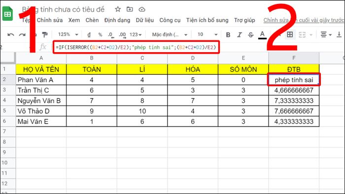 Giải thích: Nếu phép tính tổng ba môn chia hệ số môn bị lỗi, hiển thị “phép tính sai”, ngược lại trả về kết quả của phép tính (B2+C2+D2)/E2).