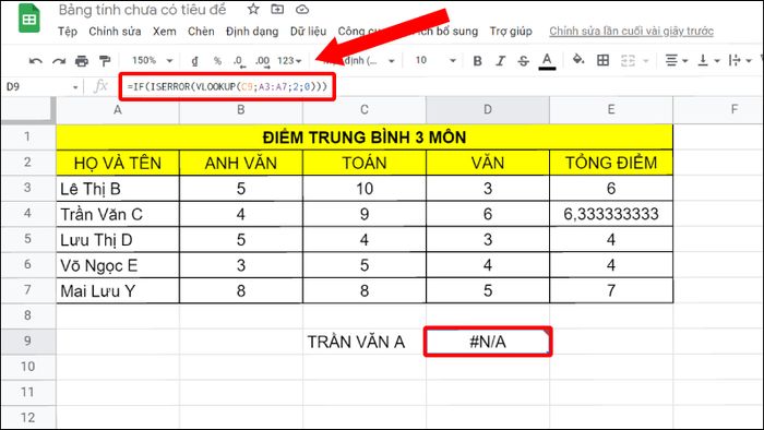 Hình minh họa về lỗi #N/A trong Google Sheet