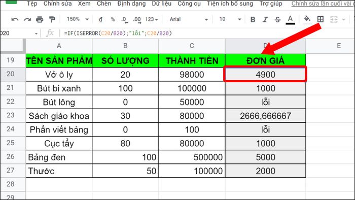 Bước 1: Nhập hàm =IF(ISERROR(C20/B20);'lỗi';C20/B20).