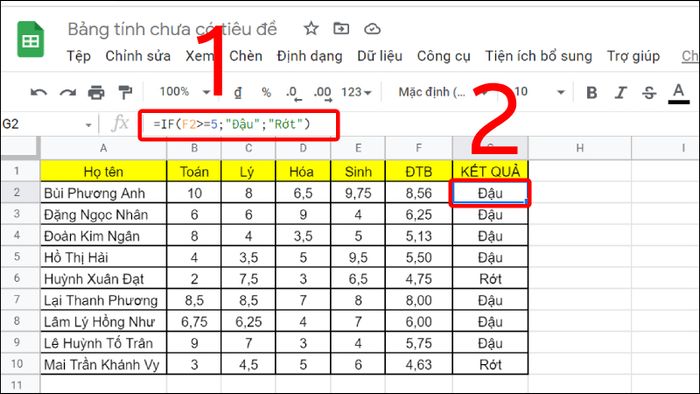 Giải thích: So sánh nếu F2 lớn hơn hoặc bằng 5 thì cho ra kết quả Đậu, ngược lại thì Rớt.