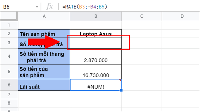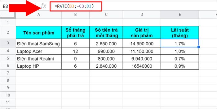 + B3;C3;D3: Tương ứng với số tháng trả, số tiền trả mỗi tháng, giá trị sản phẩm.