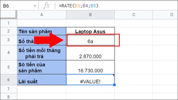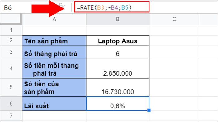 Sử dụng hàm RATE trong Google Sheet để tính lãi suất hàng tháng.