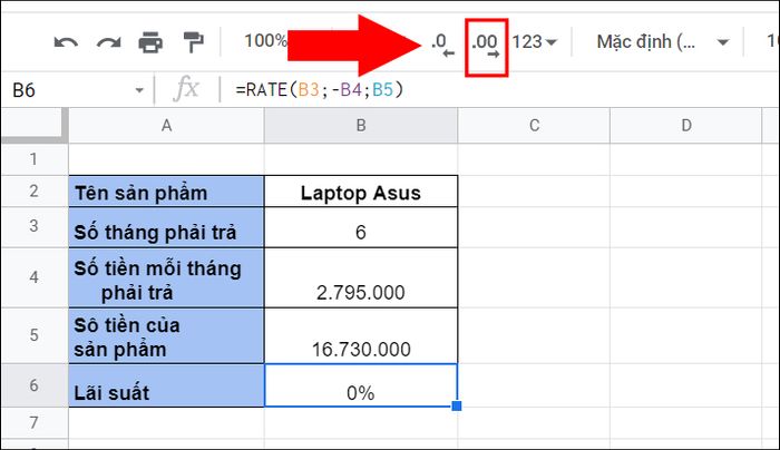 Nếu bạn tính lãi suất thấp hơn 1% (0.5%, 0.7%) và ô tính lãi suất không được định dạng số thập phân, bạn sẽ gặp phải sự cố này. Giải quyết bằng cách nhấn vào biểu tượng dưới hình để định dạng số thập phân cho ô.