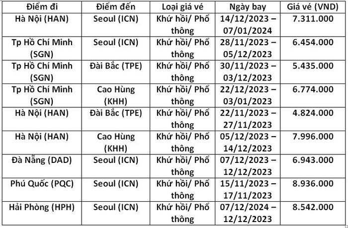 - You can check the updated flight prices to South Korea and Taiwan through the detailed table below, provided by Mytour: