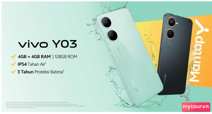 Pin dung lượng lớn 5000mAh hỗ trợ sạc nhanh 15W qua cổng USB-C. Các tính năng khác bao gồm SIM kép, 4G VoLTE, WiFi kép, Bluetooth 5.0 và GPS. Kích thước của máy là 163.78 x 75.73 x 8.39mm, nặng 185 gram. vivo Y03 cũng có khả năng chống bụi và nước theo tiêu chuẩn IP54.