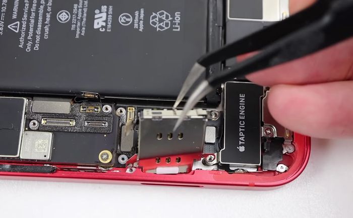 Tiếp tục tháo một số linh kiện liên quan trước khi chuyển sang mạch đọc sim, đặt trên bộ rung Taptic Engine.