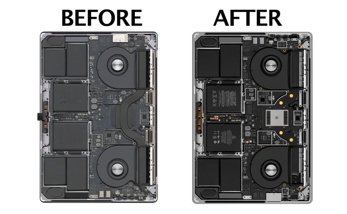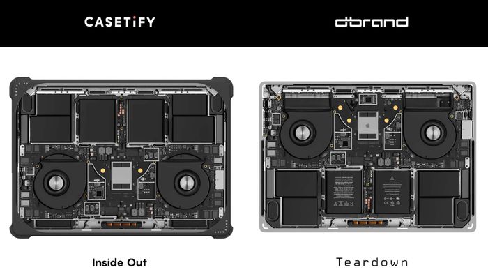 Youtuber JerryRigEverything cho biết Casetify không muốn tự làm mẫu thiết kế vì công việc này đòi hỏi sự tỉ mỉ và tốn nhiều thời gian. Mỗi thiết kế miếng dán hoặc ốp trong suốt đều cần nhiều giờ làm việc (vì vậy, dĩ nhiên Dbrand và Jerry đã thêm rất nhiều Easter Egg vào đó). Ở hình trên là Macbook Air, phía bên trái là hình scan màu, phía bên phải là sản phẩm miếng dán được bán ra thị trường.