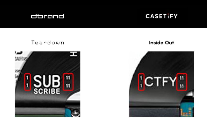 Trên ốp của Dbrand, thay vì dòng chữ Subscribe, Casetify đã sử dụng từ CTFY nhưng không thay đổi các con số 11-11-11. Không có một con chip điện thoại nào sử dụng số này, vì ngày 11/11/2011 là ngày mà công ty Dbrand được thành lập.