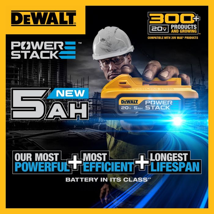 Pin DEWALT POWERSTACK™ 20V MAX* 5Ah là pin mạnh mẽ, hiệu quả và có tuổi thọ lâu nhất trong lớp pin của DEWALT cho đến nay.** Nền tảng DEWALT POWERSTACK™ đã đưa ra thị trường công nghệ mới cho ngành xây dựng, cho phép người dùng làm nhiều hơn với ít hơn, và tiến triển qua các dự án trong suốt ngày với nhiều lợi ích chính.
