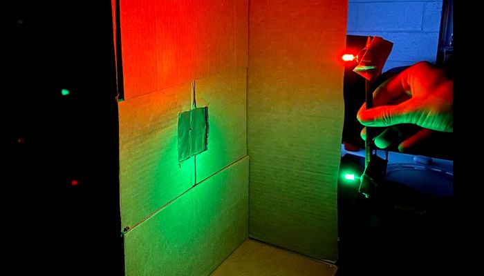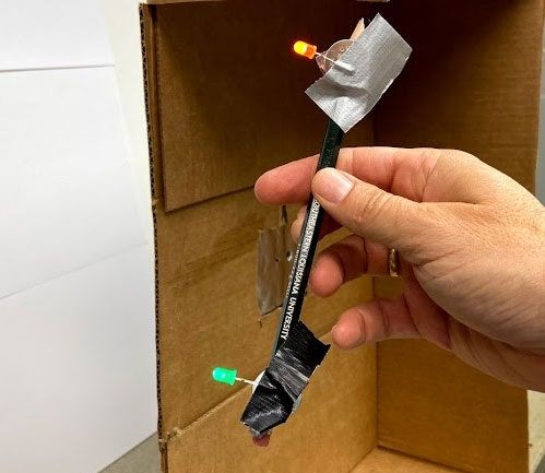 Bây giờ hãy nâng nó lên một bậc. Tưởng tượng nếu tôi có hai nguồn sáng? Giả sử tôi đặt một đèn cam phía trên một đèn xanh lá cây, cách nhau khoảng 6 inch. Điều gì sẽ xuất hiện trên màn hình? Điều này không quá khó để thiết lập. Tôi đã dính hai đèn LED vào hai đầu của một cây bút chì và sử dụng pin nút để bật chúng lên:
