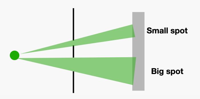 Bất ngờ! Tôi không vẽ tia sáng. Thay vào đó, tôi tạo ra một số hình nón ánh sáng. Vì lỗ không vô hạn nhỏ, có nhiều tia sáng có thể đi qua. Hình nón ánh sáng đại diện cho tất cả những tia này.