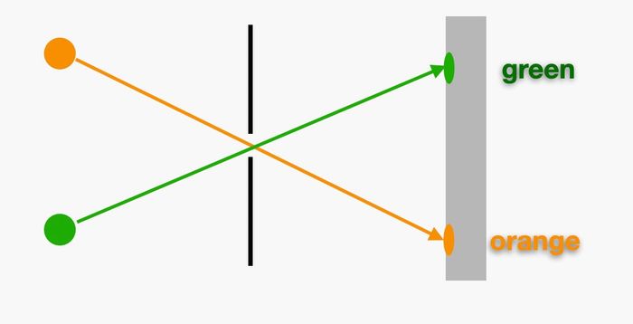 Thật sự tôi ngạc nhiên khi bức ảnh này lại thành công như vậy. Tôi đánh giá cao hiệu suất của camera iPhone trong điều kiện ánh sáng yếu. Nhưng tại sao bây giờ màu sắc lại đảo ngược, với chấm xanh phía trên chấm cam trên màn hình? Dễ hiểu với một biểu đồ tia sáng đơn giản: